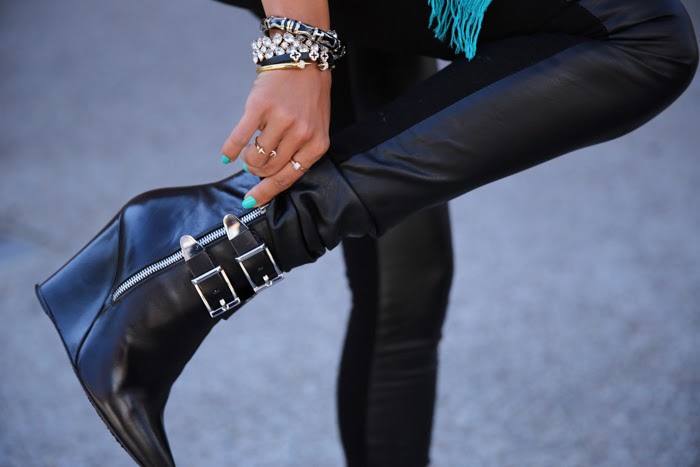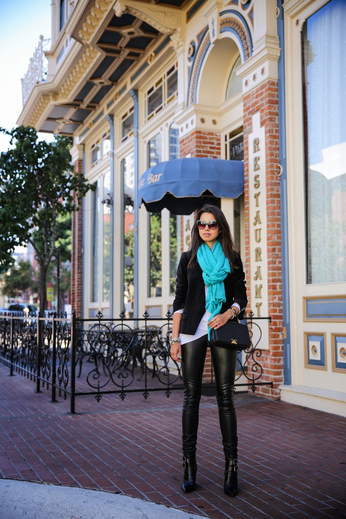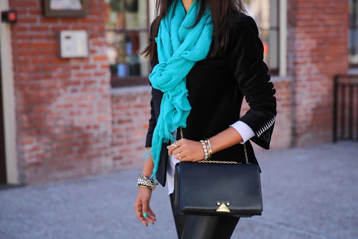 Zadig & Voltaire Vegas Velours jacket { also here } | Club Monaco Tasha stretch leather leggings | Bailey44 Road Not Taken top | Emporio Armani messenger bag | Barbara Buiboots | Spun By Subtle Luxury scarf | Vita Fede jewelry: mini titan crystal bracelet, ultra eclipse crystal midi ring & ultra mini titan crystal ring | Leather & crystal flower bracelet - old { similar options here & here } | Nordstrom enamel bangle { here 30% OFF, and also here }
