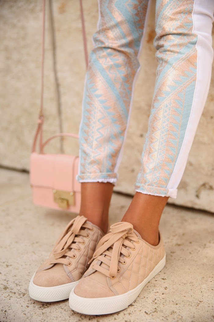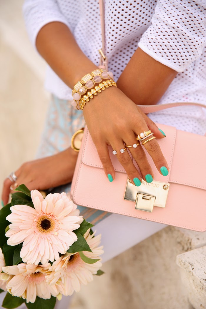 Tory Burch Caspe sneakers { also here } | Sam & Lavi Roe tee | 7 For All Mankind x Malhia Kent jeans in rose gold | Jimmy Choo Rebel grainy calf cross body bag { also love this color } | Nialaya flat bead bracelet, rose quartz string bracelet & golden scull bangle | Gold Philosophy Pearls & Spikes ring & Chance Diamond ring | Butter London nail polish in "Slapper"