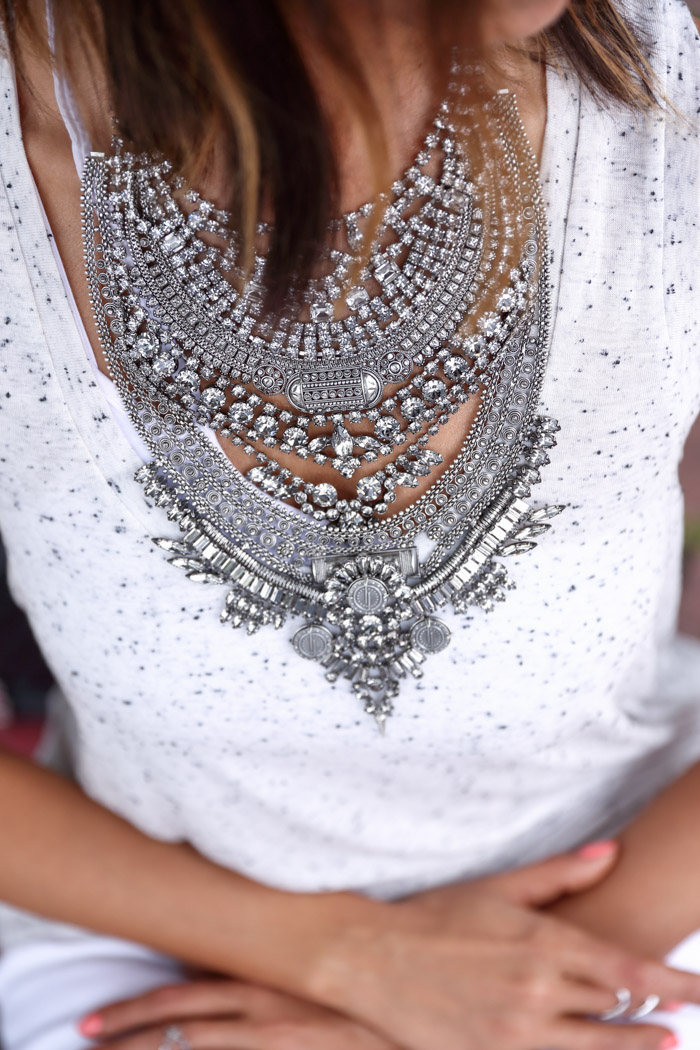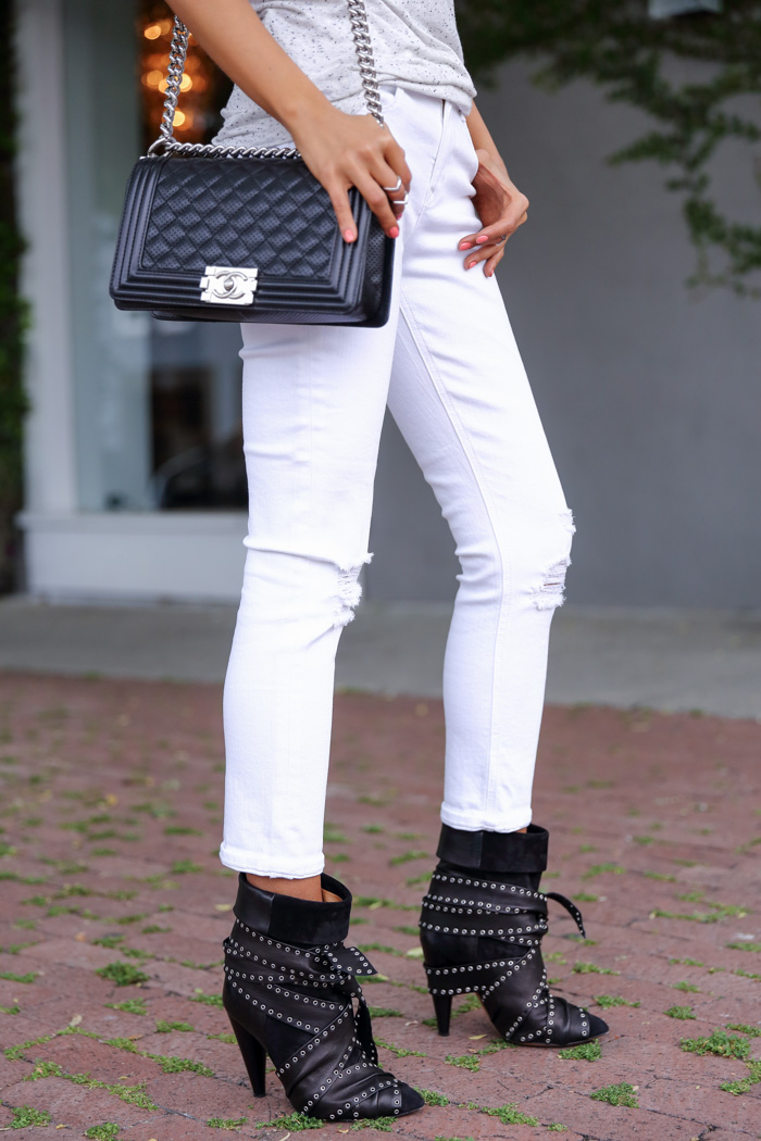 Next, on my list of Summer staples and must-haves are cropped jeans and especially cropped white distressed jeans. Why white? Well, can you seriously imagine Summer without a pair of white jeans? Personally I can't!!! And of course as far as cropped length goes, I feel that it's much more versatile and works well with anything from boots and flats to pumps and ankle wrap sandals ( in other words, I don't have to commit to wearing a particular type of shoe, which is always appreciated ). The ones I am sporting in today's post are also from Express and are one of my favorite pairs at the moment. Aside from color and length, I am partial to a bit of distressing on my jeans and these happen to have a perfect amount of ripping and distressing.